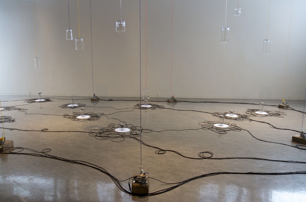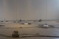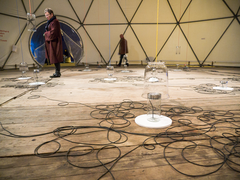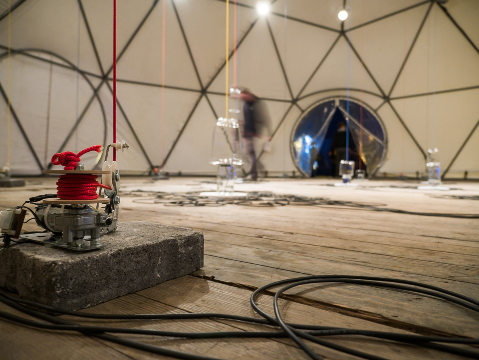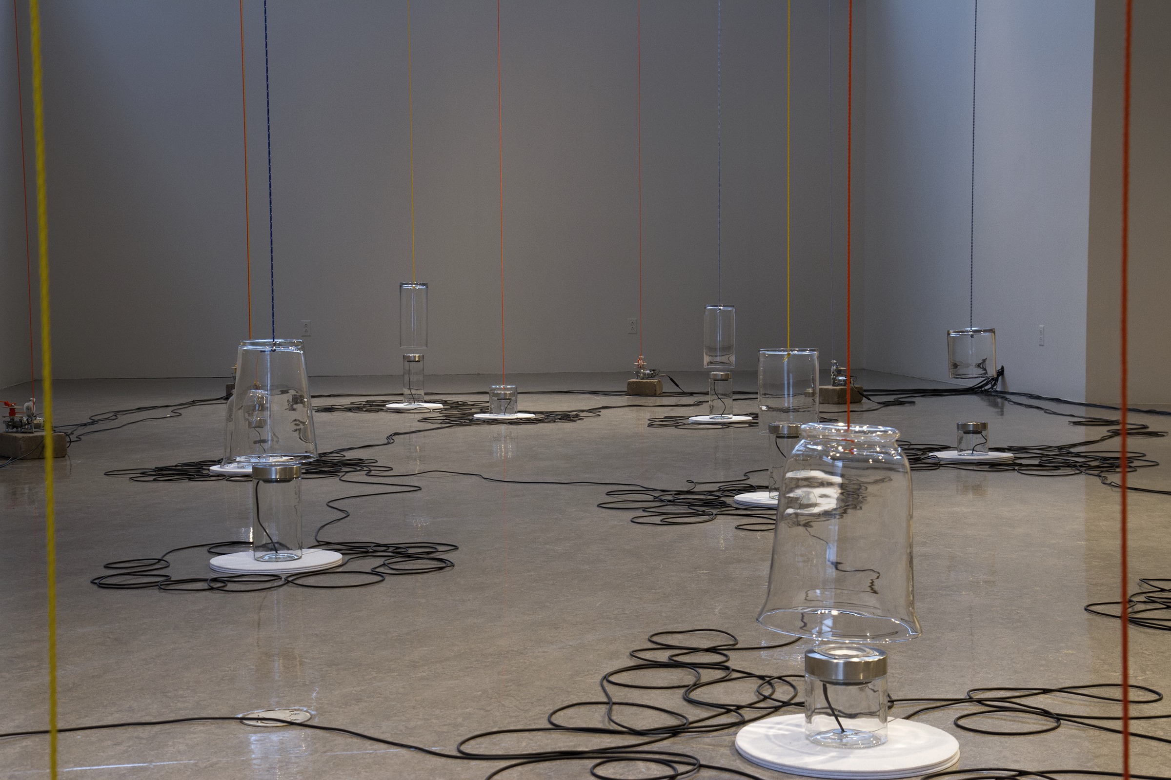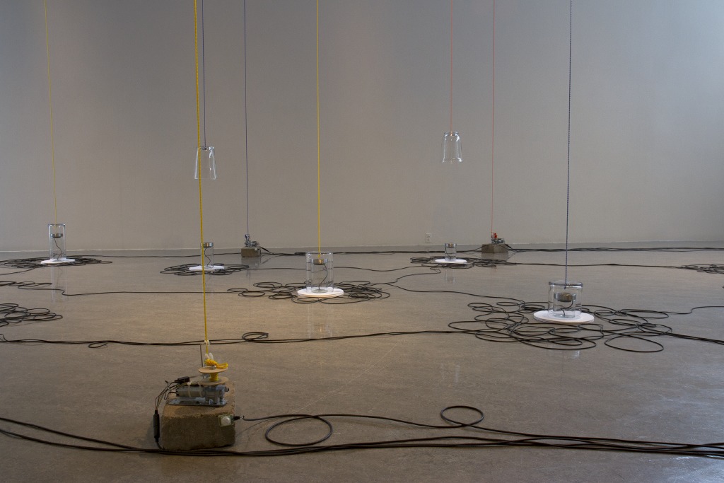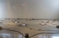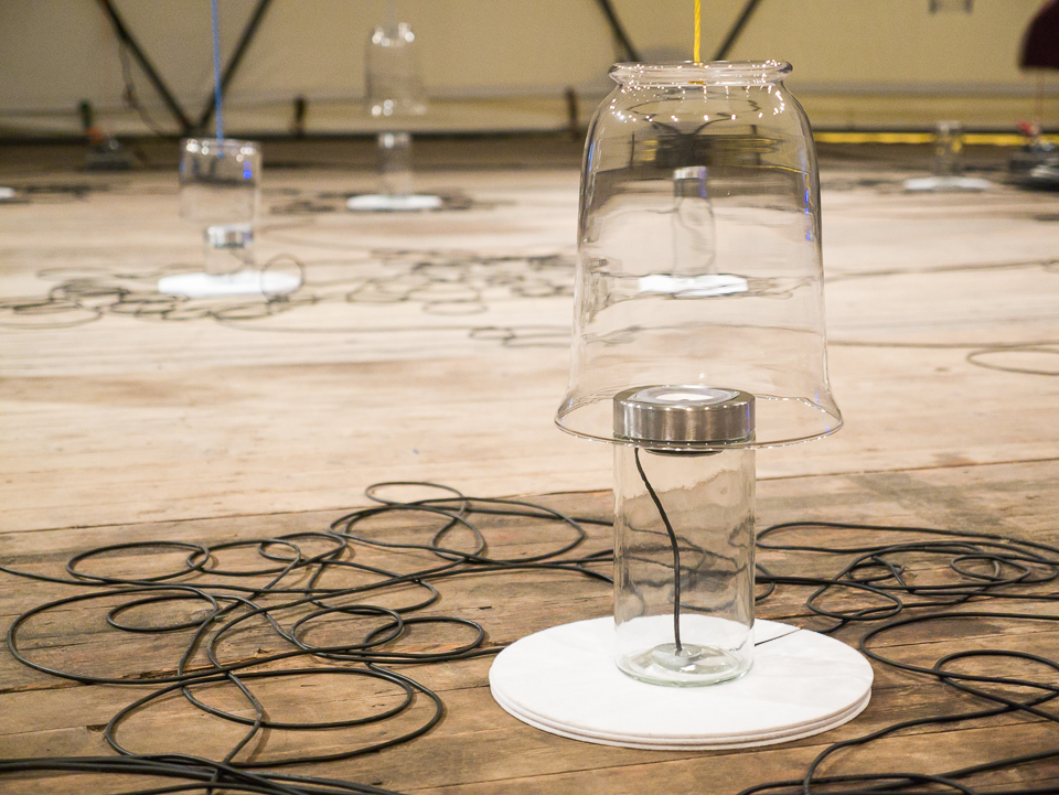 The kinetic sound installation Individual Times contains a cluster of loudspeakers inserted into the lids of multi-sized glass jars. They rest on slipmats and are each topped with a glass dome that can be rais...read more