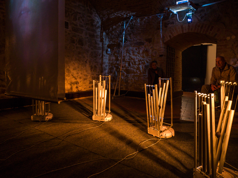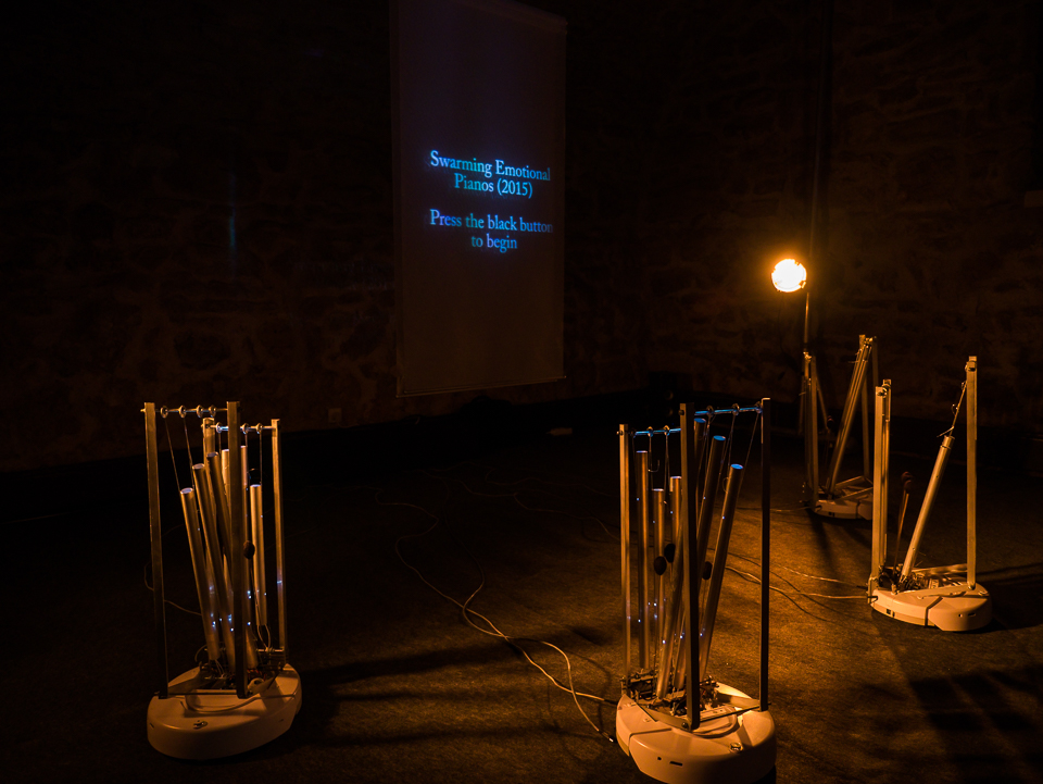 The installation version of Swarming Emotional Pianos features video documentation of an actor that silently expresses the emotions of surprise, anger, fear, sadness, sexual arousal and joy over the course of twenty minutes, at timed intervals. During this video recording, Gee attached biosensors to the actor in order to capture data related to his physiological emotional state through brea...read more