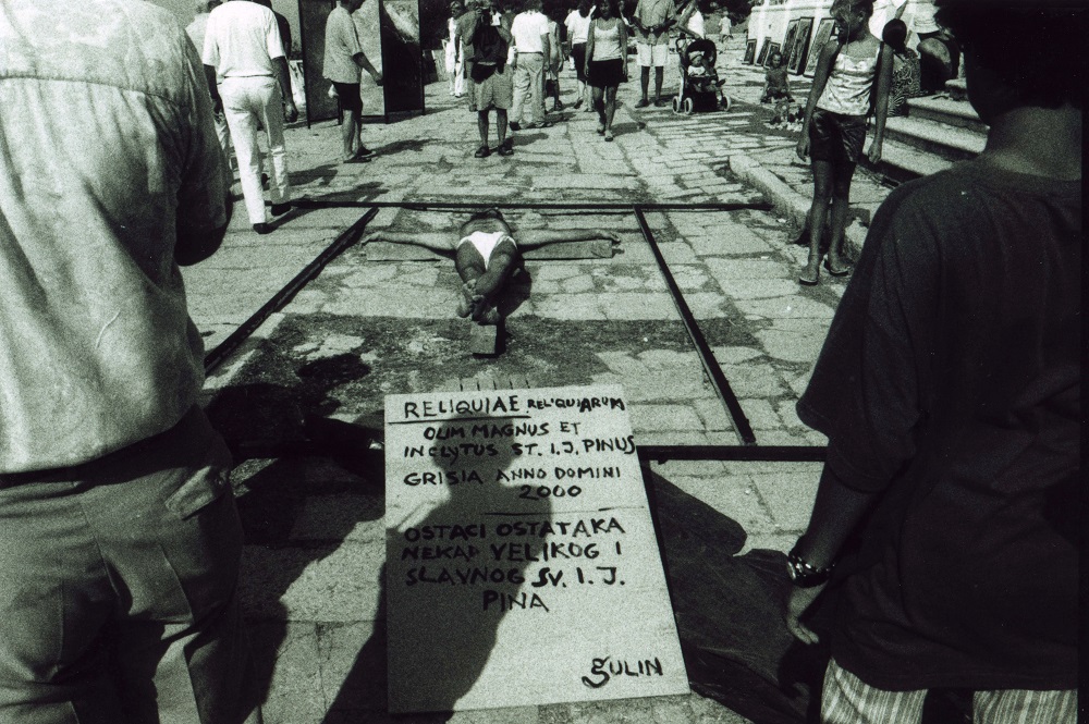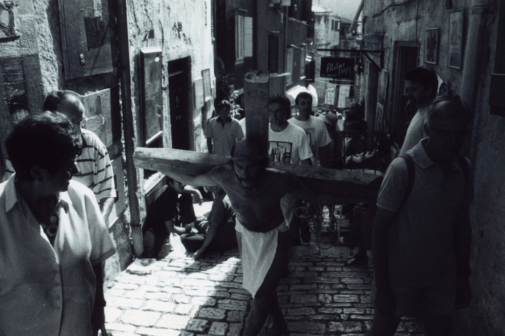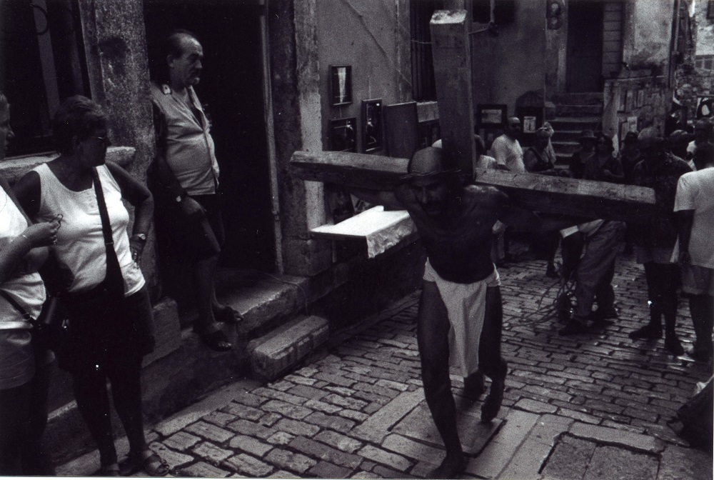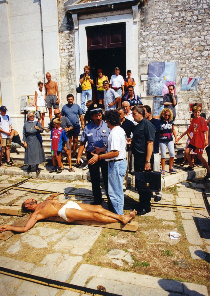 Since the crucifix is an age-old symbol of human suffering omnipresent from the Roman Empire (when crucifixion was one of the means of torture and execution) and the foundation of Christianity until the present age, the cross and the man on the cross have been chosen as the backbone of the performance’s message. This scene is often used in theatres, religious feasts (Easter), performances, films and in general in the visual arts, and gives rise to no scandal even in lands where Christianity p...read more